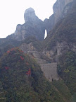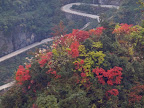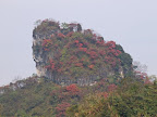 I have no idea if it is a freak of nature or it has been arranged. That particular peak we passed is the only one that was covered with red coloured leaves vegetation in autumn. The rest is simply dull green or yellow, unlike the cliffs at HwangShan.