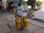 Amazing skill. He carried 4 tubes at one go, and look at the road condition.