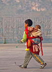 A young boy carrying his baby brother near Beipan River Bridge
