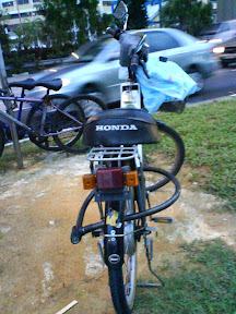 Obviously a scrap assembly, this motorized bicycle parked outside Serangoon MRT station fancily showed a Honda motorbike seat. It will be more comfortable to ride I believe.
